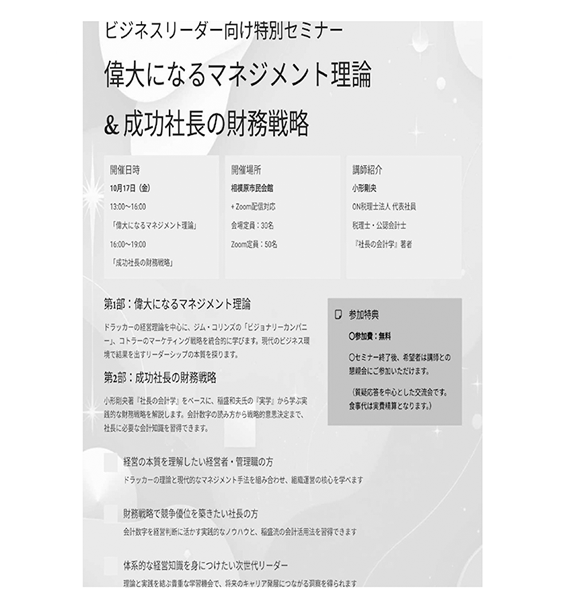 偉大になるマネジメント理論&成功社長の財務戦力セミナーの参加者募集中です。